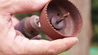 Tenes que dejar mas o menos 10 cm entre un hueco y el otro y la distribución será en función de lo que te permita el recipiente. Para los agujeros yo voy a usar una copa de 2 pulgadas y media, si no podes conseguir una, entonces vas a tener que hacer algunos agujeros con la perforadora y después darle con una sierrita con un poco de paciencia.