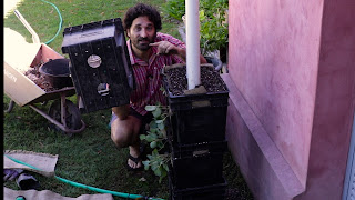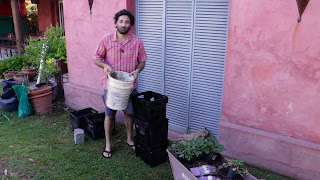 Para construir la torre podemos utilizar distintos materiales. Yo voy a usar unos cajones de leche que compré usados. Están buenos porque se pueden apilar y el cajon de arriba no compacta la tierra del cajón de abajo. También podes usar tachos de pintura limpios o macetas viejas de 20 litros. En estos casos es buena idea arreglarnos con algunos palitos o fierros para que cada balde apoye sobre estos palos y no sobre la tierra del balde de abajo.