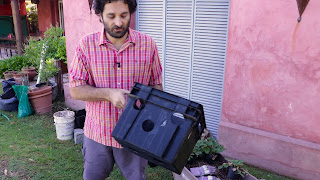 Antes de llenar los recipientes con tierra vamos a cubrir las paredes perforadas con una tela geotextil, si no tenes (yo tenia pero no la encuentro por ningún lado) podes usar media sombra o arpillera. Yo voy a usar arpillera. Vamos a poner la arpillera en el primer recipiente te recomiendo que si no tenes a alguien que te ayude la sostengas con alguna pinza hasta que llenes con tierra.