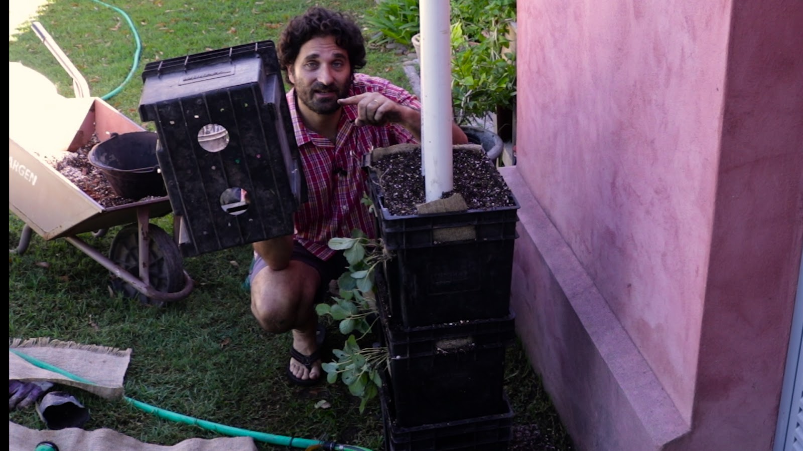 Una vez que completamos el primer cajón, vamos a poner arriba al próximo. Lo vamos a cubrir con tela y vamos a perforar donde van a pasar nuestros caños de riego.